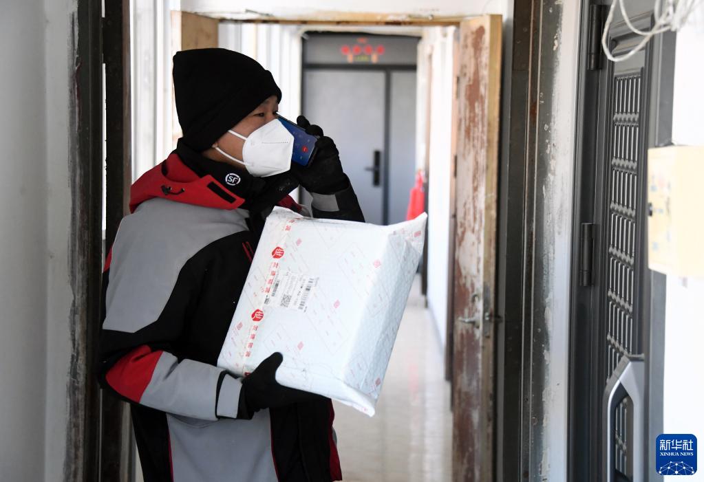 1月28日,順豐速運快遞員楊敬山在北京市海淀區中關村街道希格瑪社區的一座住宅樓內送兔年開工第一單快件。