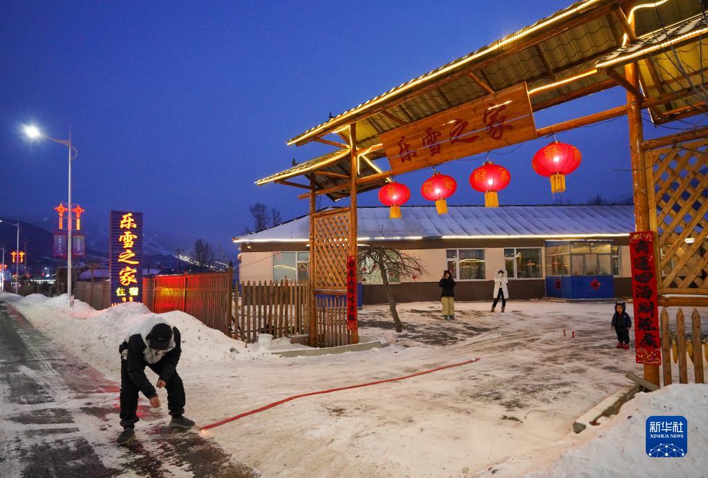 吉林市永吉縣北大湖鎮南溝村村民邵鋒在自家經營的樂雪之家民宿門口與雪友一起放鞭炮(1月21日攝)。新華社記者 顏麟蘊 攝