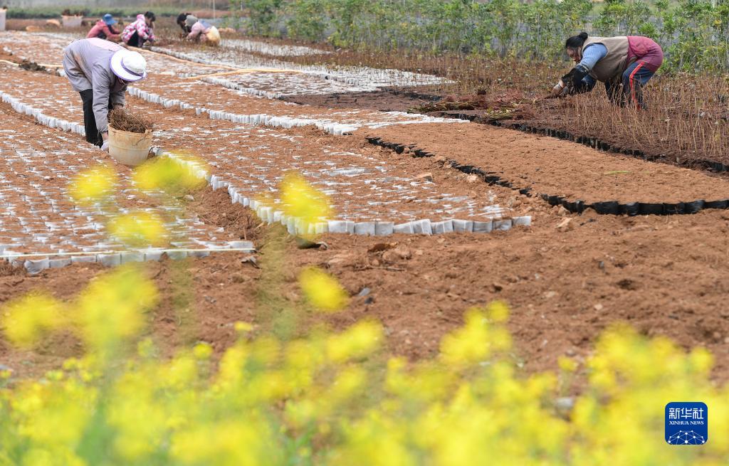 1月28日,云南省曲靖市羅平縣臘山街道大水塘村的農(nóng)民在田間育苗。