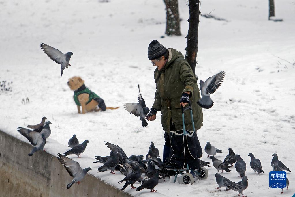 1月28日,一名女子在羅馬尼亞布加勒斯特一處公園的雪地上喂鴿子。