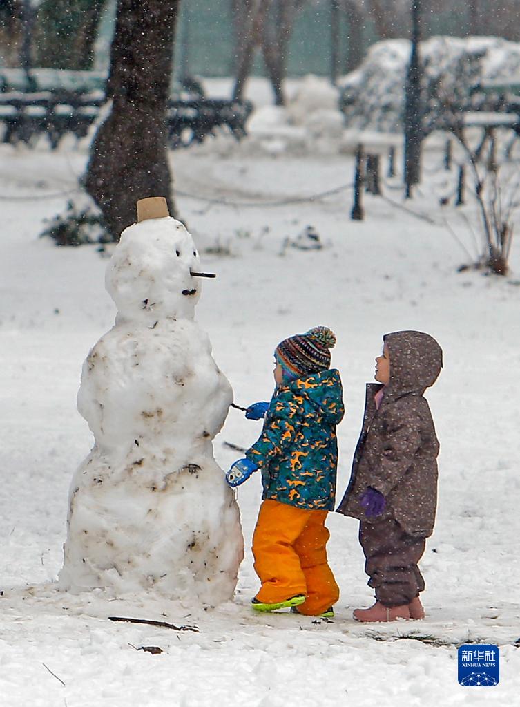1月28日,孩子們在羅馬尼亞布加勒斯特的一處公園玩雪。