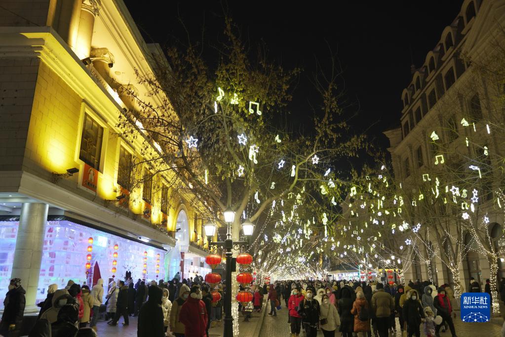 1月28日,游客從哈爾濱中央大街的“冰屋”旁經(jīng)過。