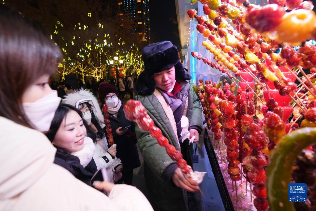 1月28日,游客在哈爾濱中央大街的“冰屋集市”上購買糖葫蘆。