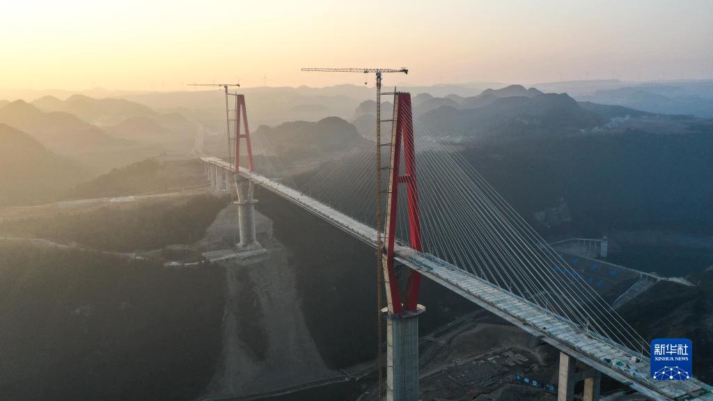 新春時節,貴州省龍里縣天氣晴好,建設中的龍里河大橋沐浴在晨光中,雄渾壯觀。龍里河大橋位于貴州省龍里縣境內,全長1260米,項目建成后將更好地服務當地旅游業發展和山區群眾出行。
