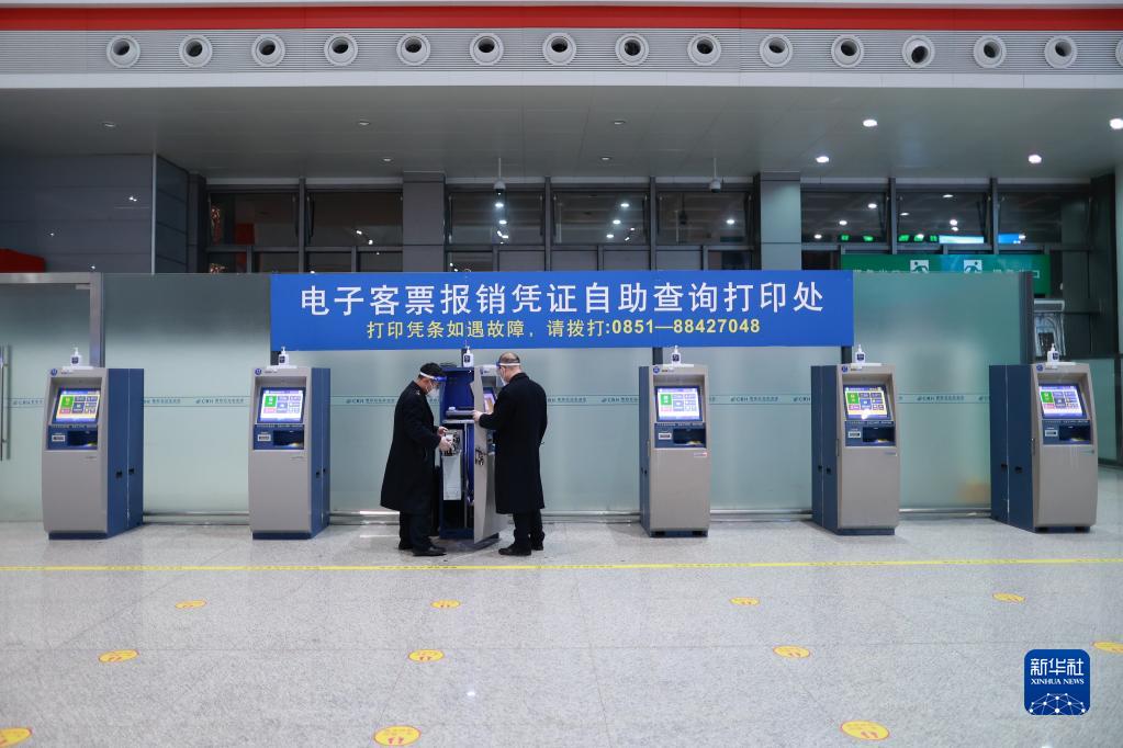 1月29日,設備檢修人員在貴陽北站維護電子客票報銷憑證打印設備。