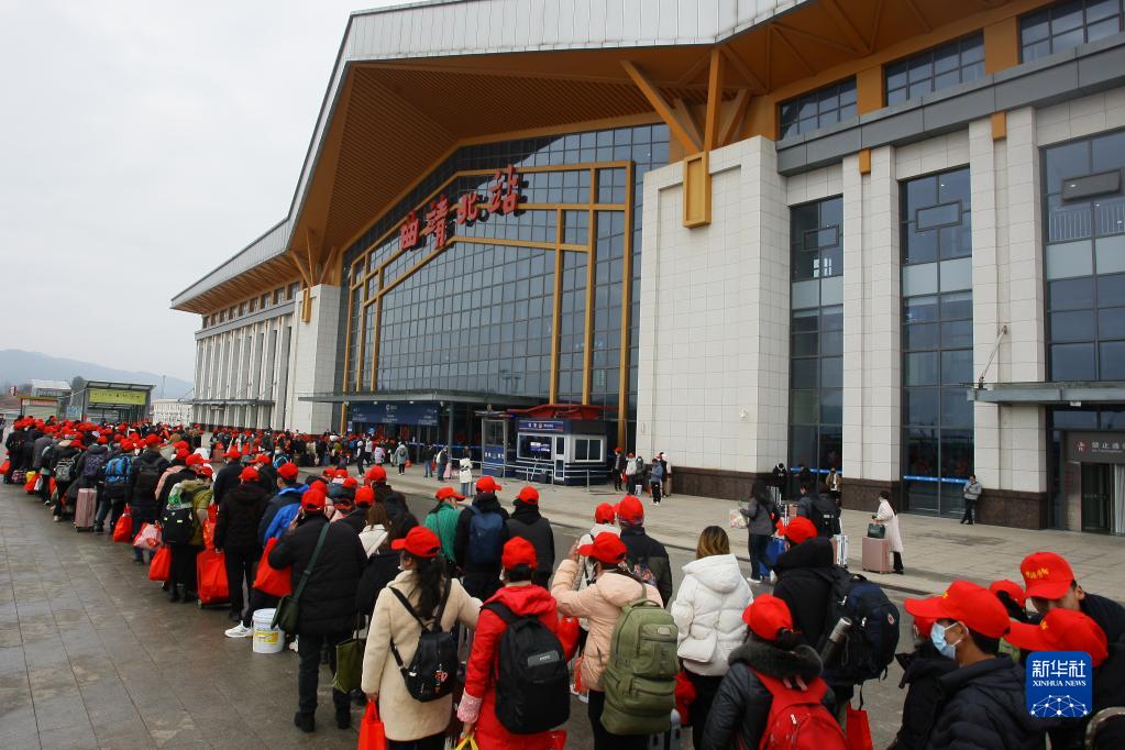 1月29日,務工人員在云南省曲靖市高鐵北站排隊進站。