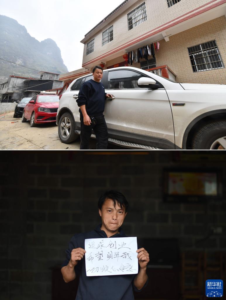 拼版照片:上圖為2023年1月22日,弄勇村弄頂屯村民蒙桂林在自己的房子和汽車前;下圖為2015年2月14日,蒙桂林寫下新年愿望——希望返鄉(xiāng)創(chuàng)業(yè)有收獲。