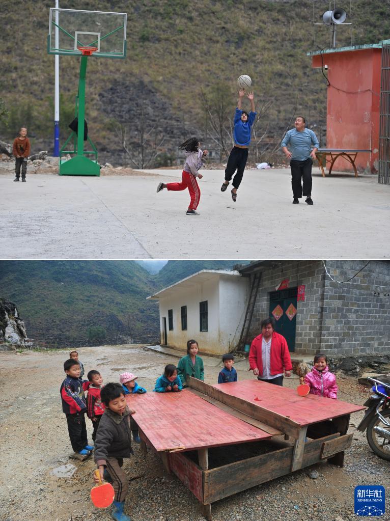 拼版照片:上圖為2023年1月15日,在弄勇村弄頂教學(xué)點(diǎn),返鄉(xiāng)過(guò)年的藍(lán)財(cái)宏(右一)和孩子們?cè)谛陆ǖ幕@球場(chǎng)上打籃球;下圖為2012年12月27日,在弄頂教學(xué)點(diǎn),時(shí)任代課老師的藍(lán)財(cái)宏(右二)和學(xué)生們?cè)诤?jiǎn)易球桌上打乒乓球。