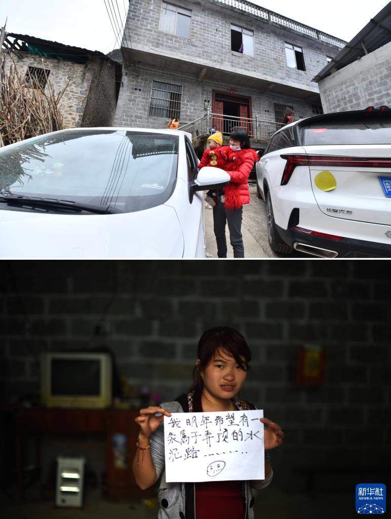 拼版照片:上圖為2023年1月15日,弄勇村弄頂屯的水泥路已通到家家戶戶門口,村民藍春花將汽車停在家門口;下圖為2015年2月14日,藍春花寫下新年愿望——希望弄頂屯通水泥路。