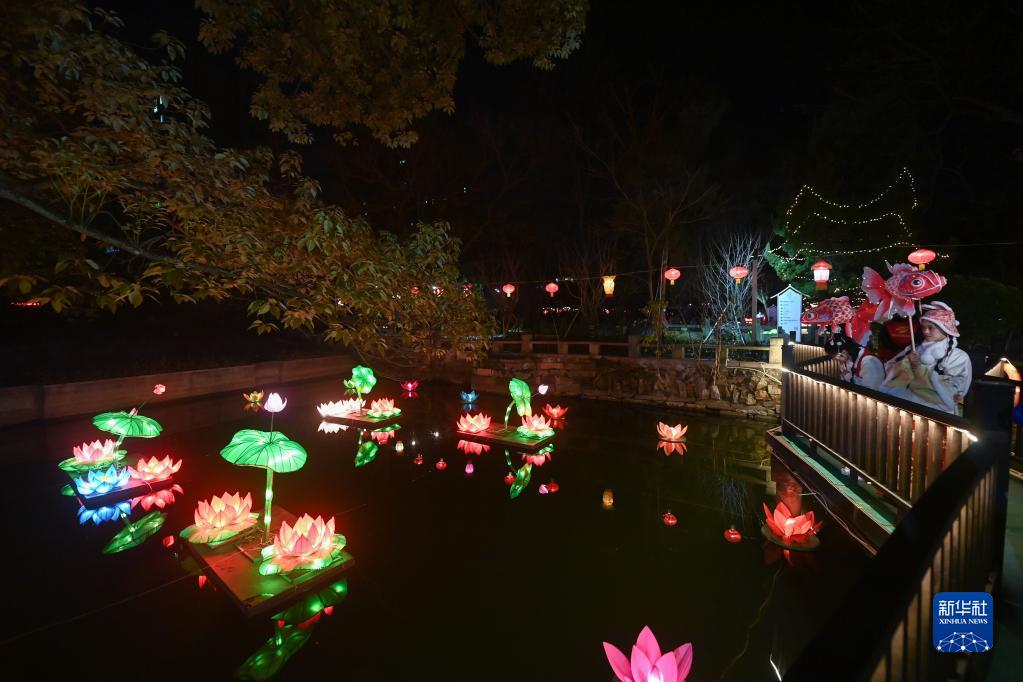 1月29日,在嘉興市秀洲區新塍古鎮小蓬萊公園內,人們前來觀賞“鰲山燈會”的彩燈。