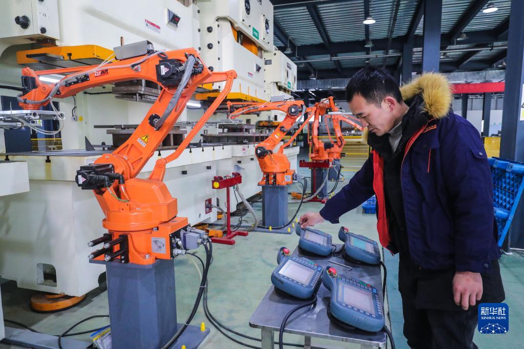 1月29日,在河南省信陽市光山縣三元光電科技扶貧車間內(nèi),工人操作機器人趕制新年訂單產(chǎn)品。