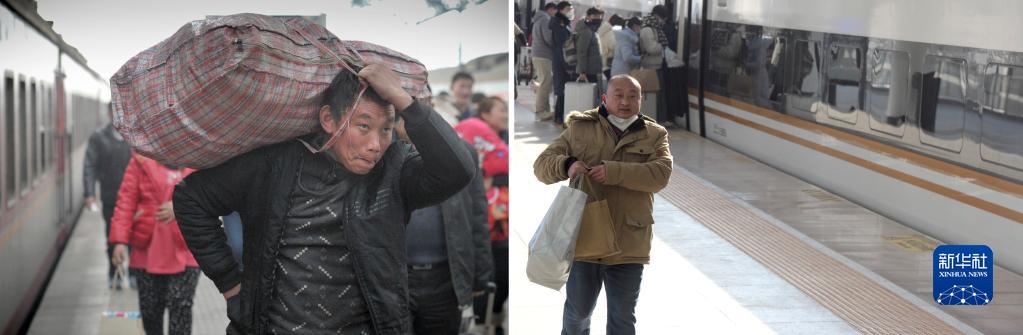 拼版照片:左圖為2013年2月13日,一名背著行囊的旅客在阜陽火車站準(zhǔn)備登車;右圖為2023年1月27日,一名拿著行李的旅客在阜陽西站內(nèi)準(zhǔn)備登車。