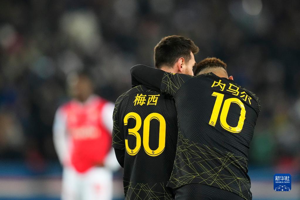 1月29日,在法國巴黎王子公園球場,巴黎圣日耳曼隊球員梅西(左)和隊友內(nèi)馬爾身著印有中文名字的隊服。