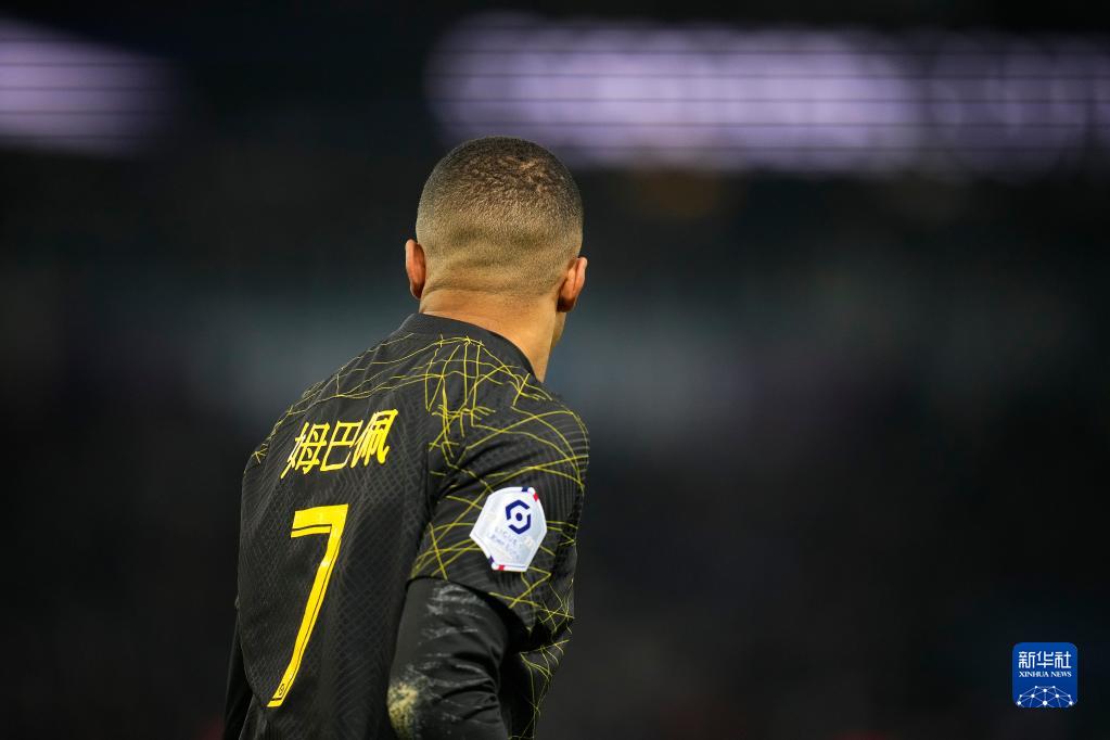1月29日,在法國巴黎王子公園球場,巴黎圣日耳曼隊球員姆巴佩身著印有中文名字的隊服。