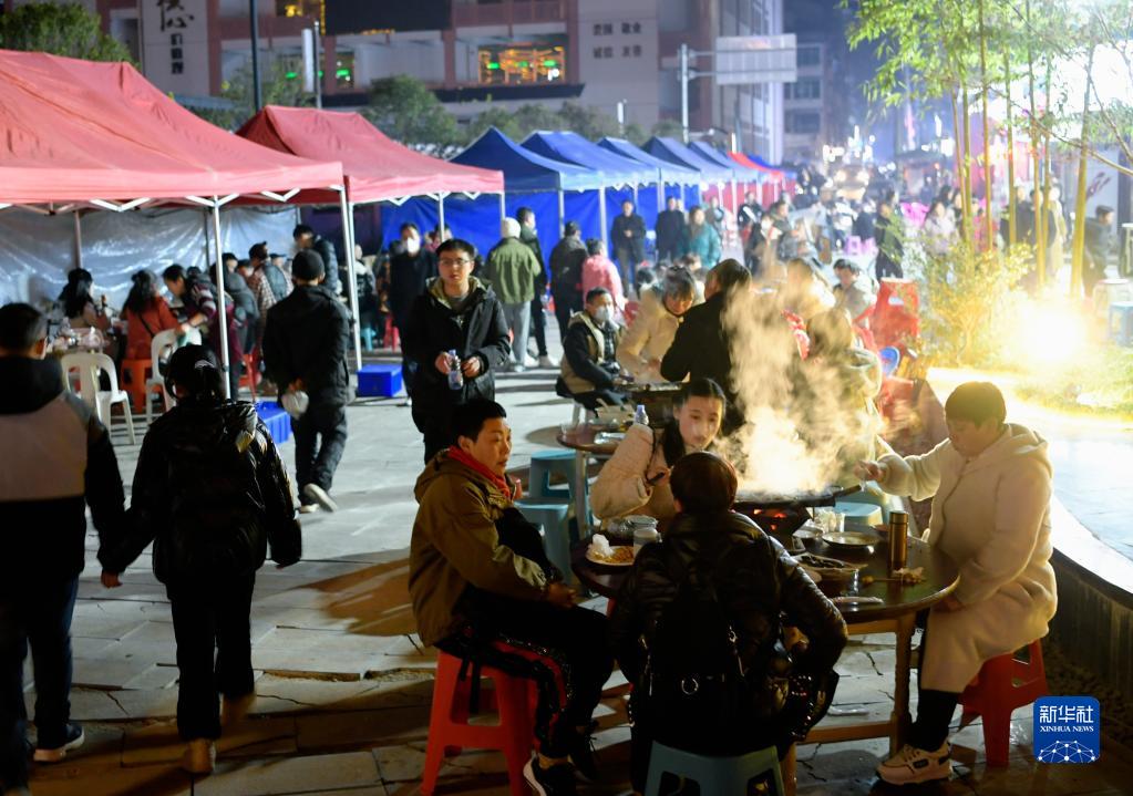 1月29日,游客在宣恩縣仙山貢水旅游區體驗露天夜宵。