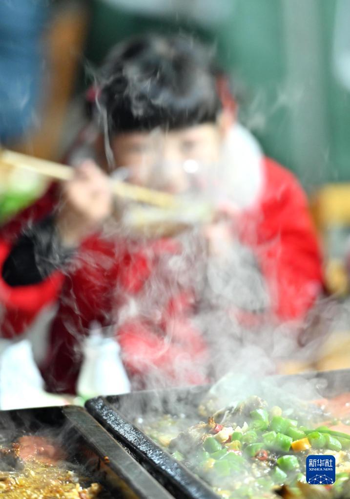 1月29日,游客在宣恩縣仙山貢水旅游區品嘗當地美食。