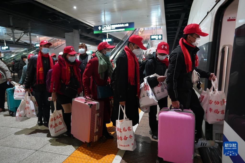 當日,來自云南省多地的370多名務工人員在昆明南站免費搭乘動車前往廣東返崗務工。近年來,云南省努力實現“兩需求一暢通”,將農村勞動力返崗就業需求與企業用工需求無縫對接,暢通群眾“從家門到廠門”返崗就業通道。