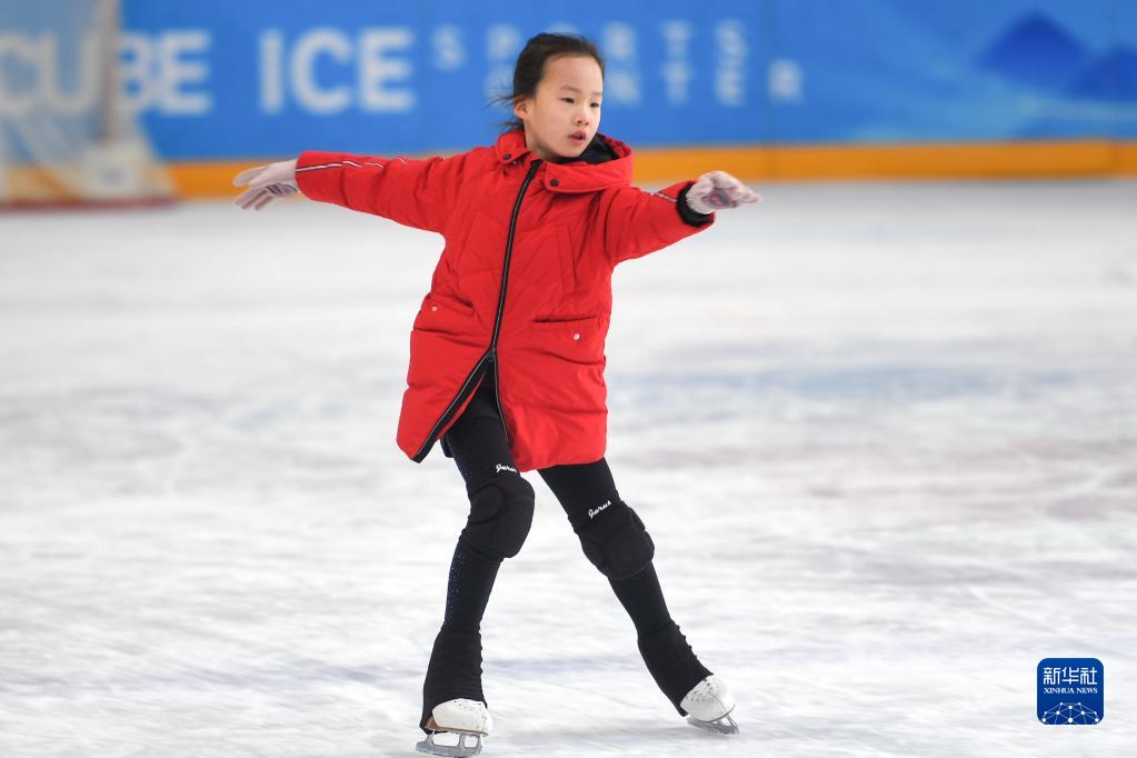 1月29日,一名小朋友在“冰立方”冰上運動中心滑冰。