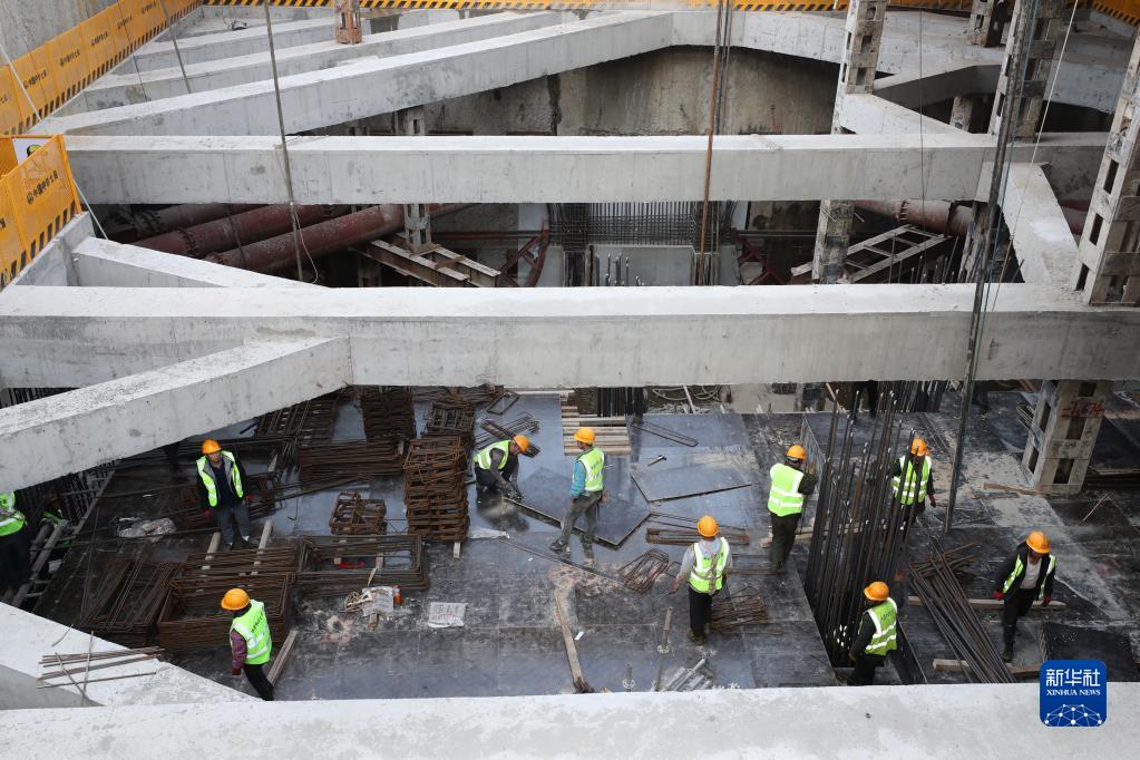 中鐵七局建設者在福州地鐵濱海快線閩都站內施工(1月29日攝)。目前福州地鐵濱??炀€全線車站已動工,10個車站主體結構已封頂,19臺盾構機正在掘進。