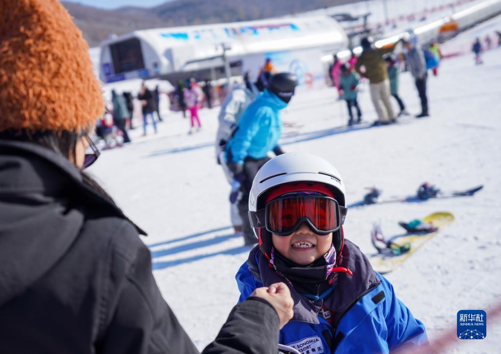 1月30日,小朋友在吉林市萬科松花湖度假區(qū)滑雪。