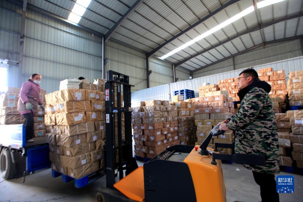 1月30日,在山東省臨沂市平邑縣新華書店倉庫,工作人員在搬運(yùn)教材。