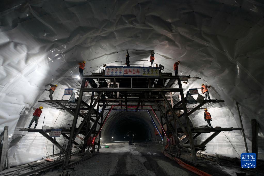 1月30日,在首都地區環線高速公路承德至平谷段楊家窩鋪特長隧道施工現場,工人在鋪設防水板。