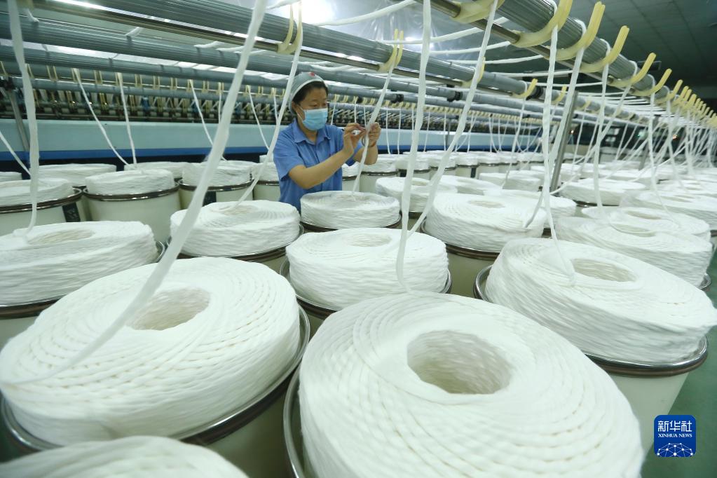 1月30日,山東省青島即發盛寶紡織有限公司的紡織工人在智能化生產線上生產棉紗產品。