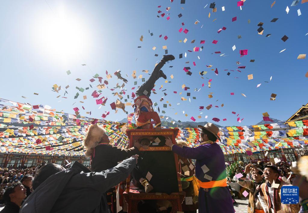 當(dāng)日,在夾金山山腳下,四川省雅安市寶興縣磽磧藏族鄉(xiāng)的藏族群眾身著盛裝,慶祝一年一度的“上九節(jié)”。近年來,民俗旅游接待成為當(dāng)?shù)刂еa(chǎn)業(yè),“上九節(jié)”已成為當(dāng)?shù)赝平槊袼茁糜蔚囊粡堥W亮名片。