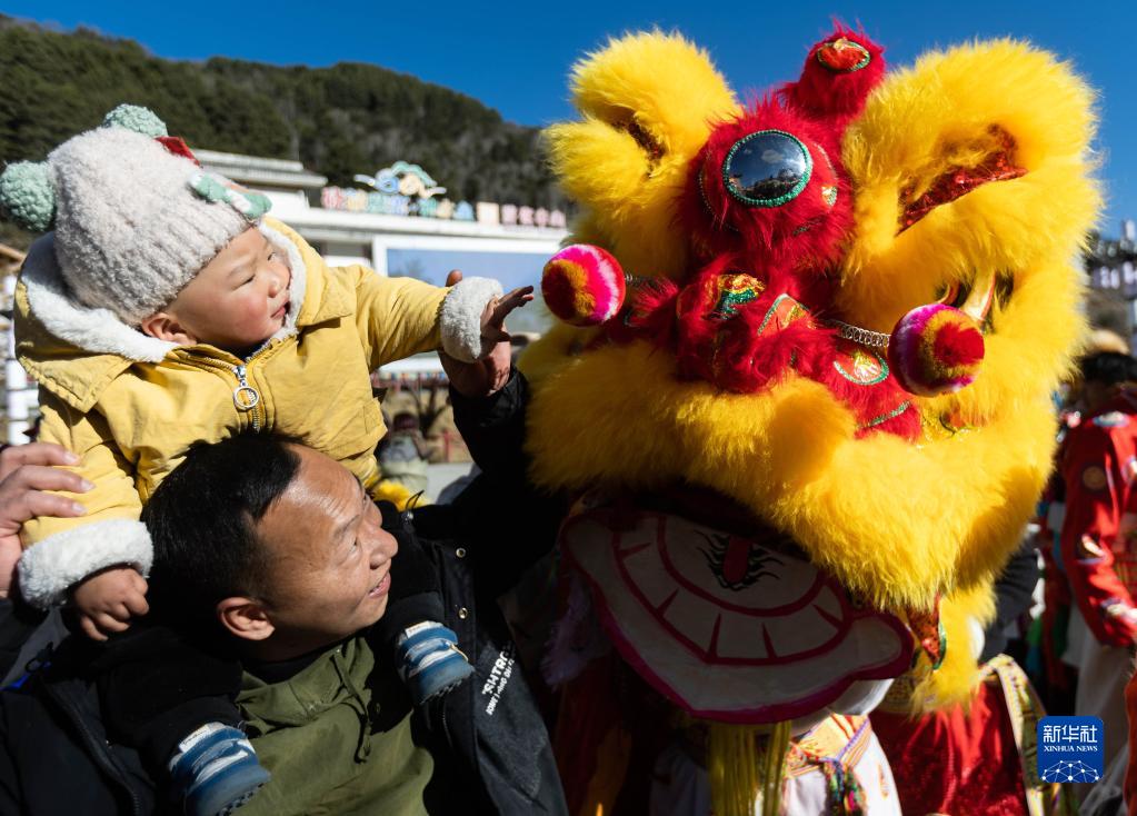 1月30日,騎在家長背上的小朋友好奇地觸摸“獅子頭”。