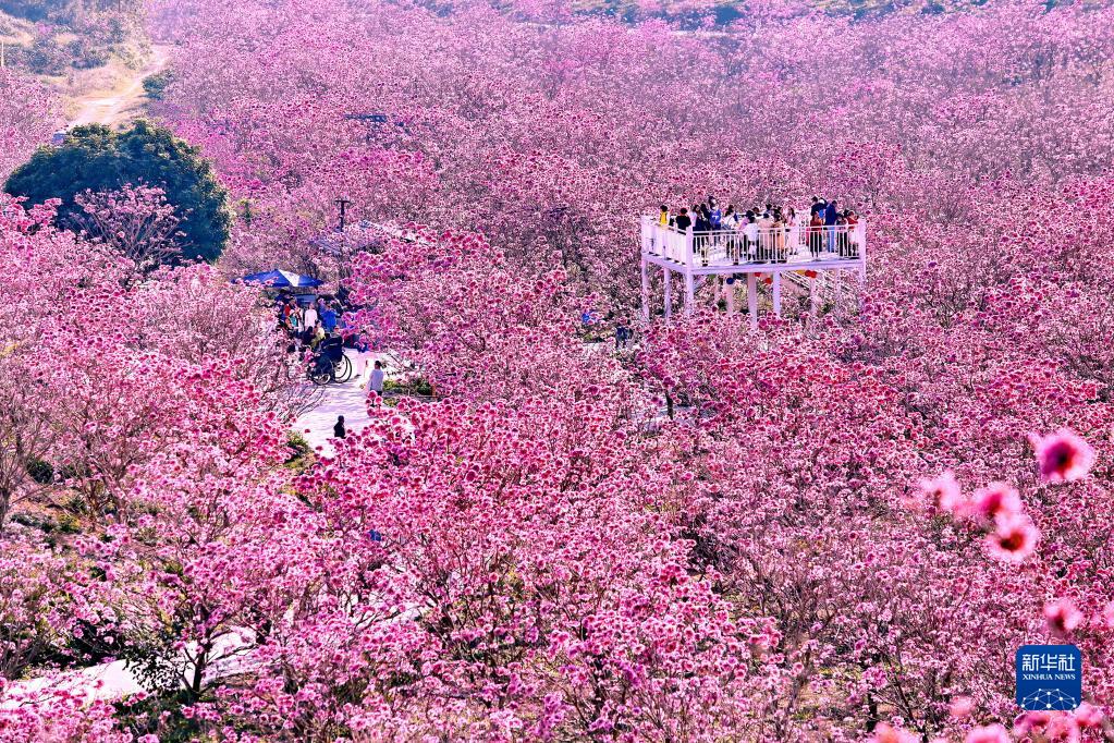 1月29日,游客在江門市新會區(qū)大澤鎮(zhèn)山頭坪游玩賞花。