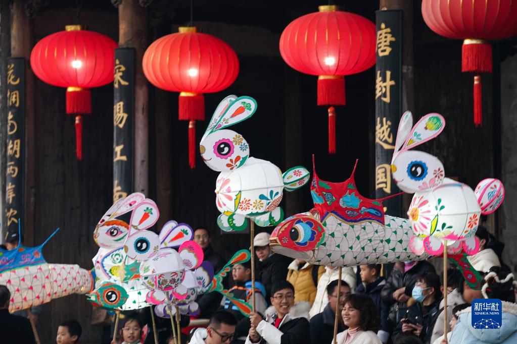 兔年新春,在安徽省黃山市黟縣宏村,當地舉行的花燈研習班邀請游客共同制作兔子形狀花燈。傍晚時分,五顏六色的“兔燈”在古村中點亮,游客在“鬧花燈”中體驗徽州年俗。