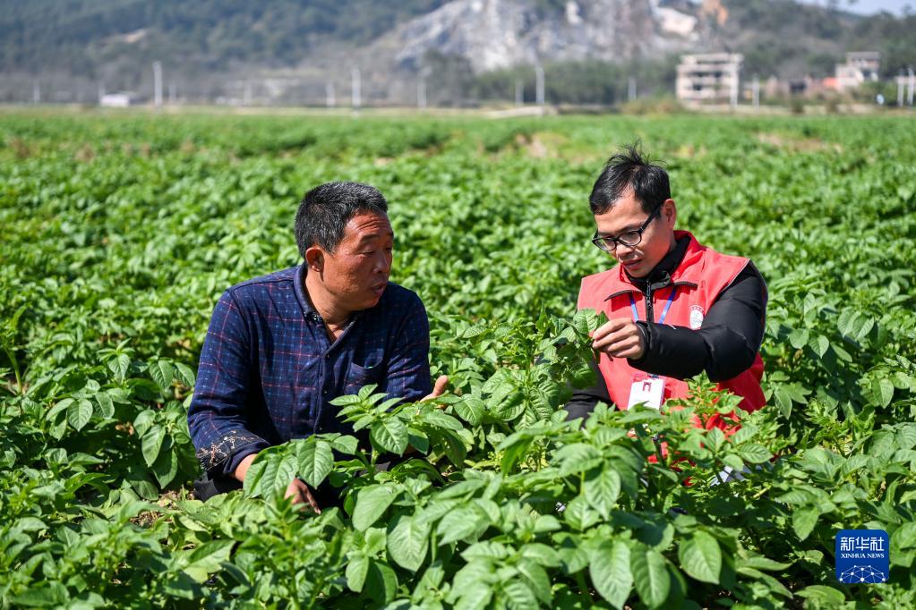 1月30日,在廣西興業縣石南鎮的一處農田里,當地農業部門的科技特派員(右)觀察農作物長勢。