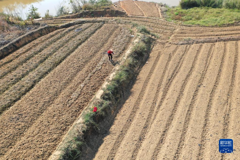 1月30日,村民在廣西南寧市青秀區仙葫經濟開發區那舅社區那平村平整田地(無人機照片)。