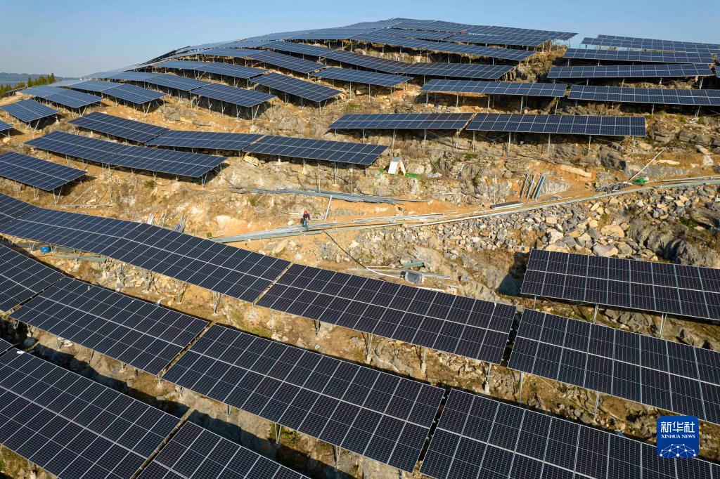 1月30日,工人在貴州省黔西市一光伏電站項目施工現(xiàn)場忙碌(無人機照片)。