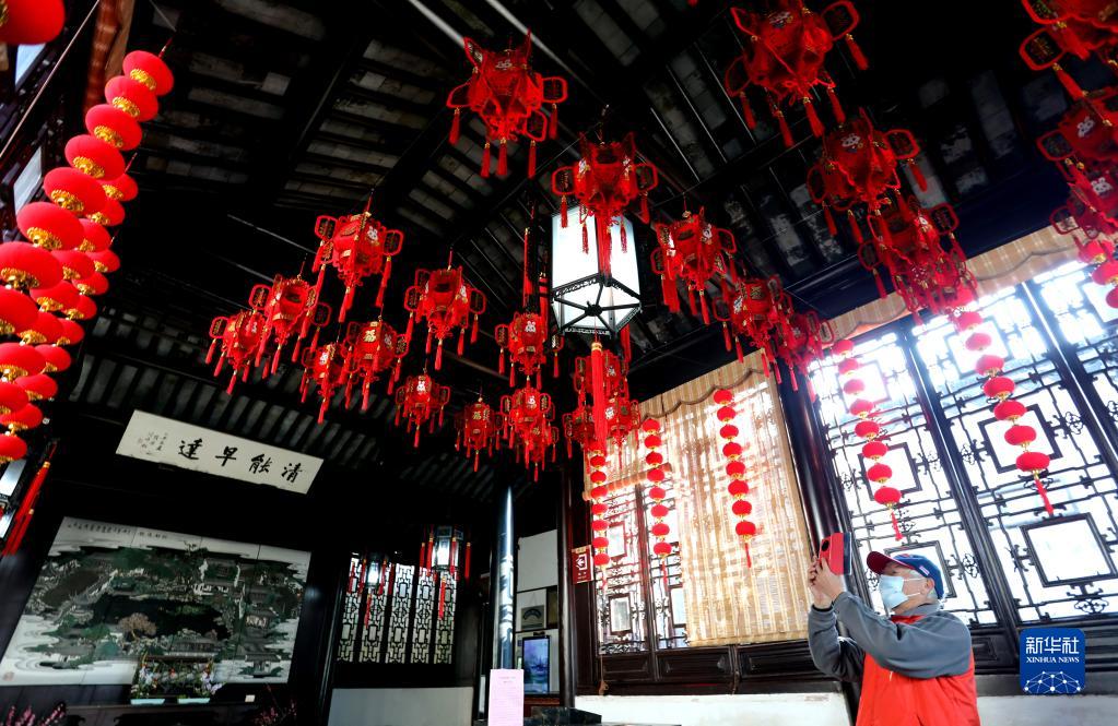 1月30日,一名游客在江蘇蘇州網(wǎng)師園拍攝喜慶花燈。