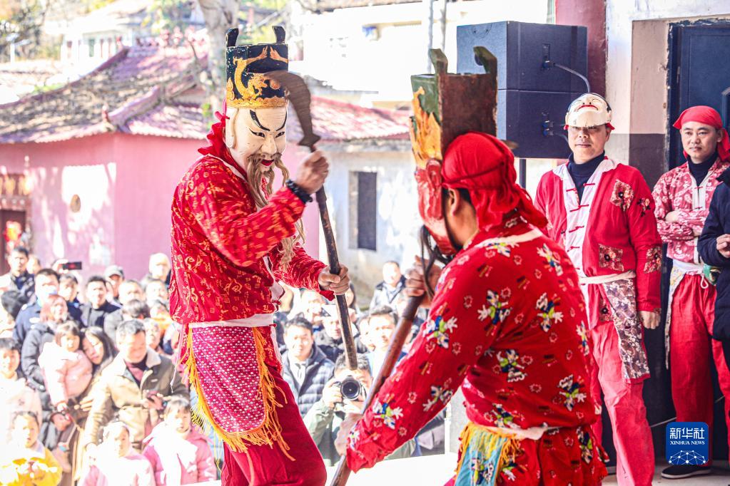 1月29日,在江西省撫州市南豐縣萊溪鄉黃滿村,儺舞藝人在表演儺舞。
