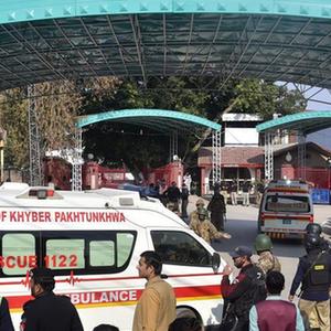 1月30日,在巴基斯坦西北部開伯爾-普什圖省首府白沙瓦市,救護車抵達爆炸襲擊事件現場。
