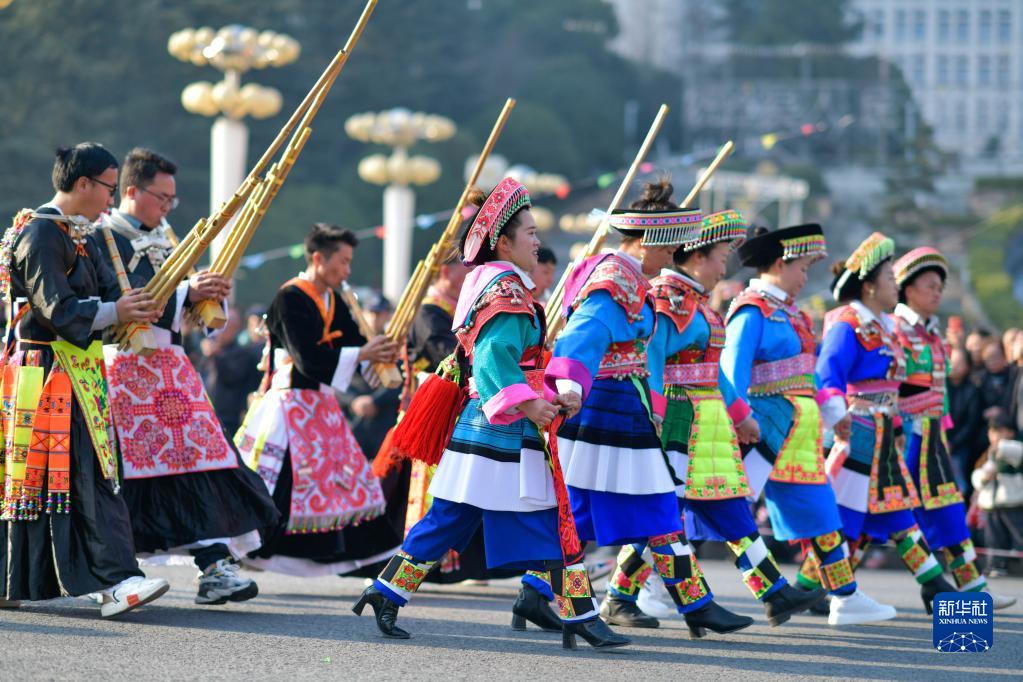 當日是正月初九,貴州省黔南布依族苗族自治州龍里縣舉辦傳統民俗“踩街”活動,通過花燈巡演、花棍舞、蘆笙舞、舞龍舞獅等民俗活動,歡度新春。