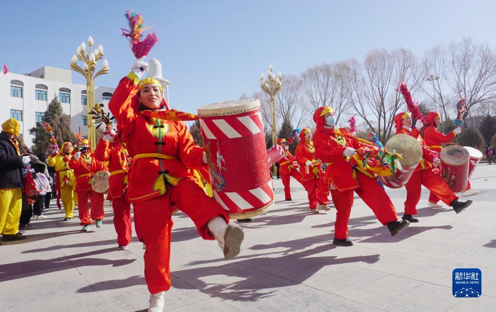 1月30日,甘肅省阿克塞哈薩克族自治縣社火隊在進行太平鼓表演。