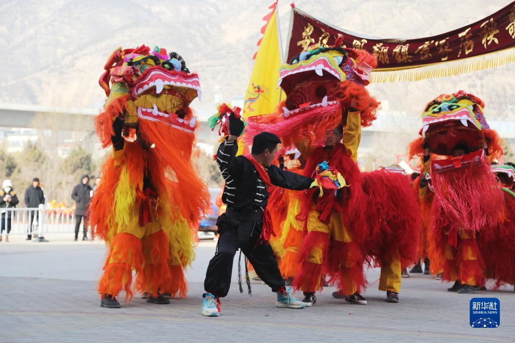 1月31日,甘肅省定西市安定區鳳翔鎮的社火隊員在表演舞獅。