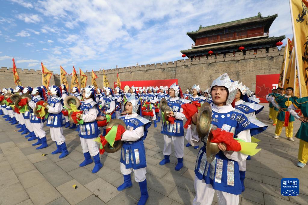 1月31日,在河北省石家莊市正定古城甕城內,正定弘文中學戰鼓隊進行戰鼓表演。