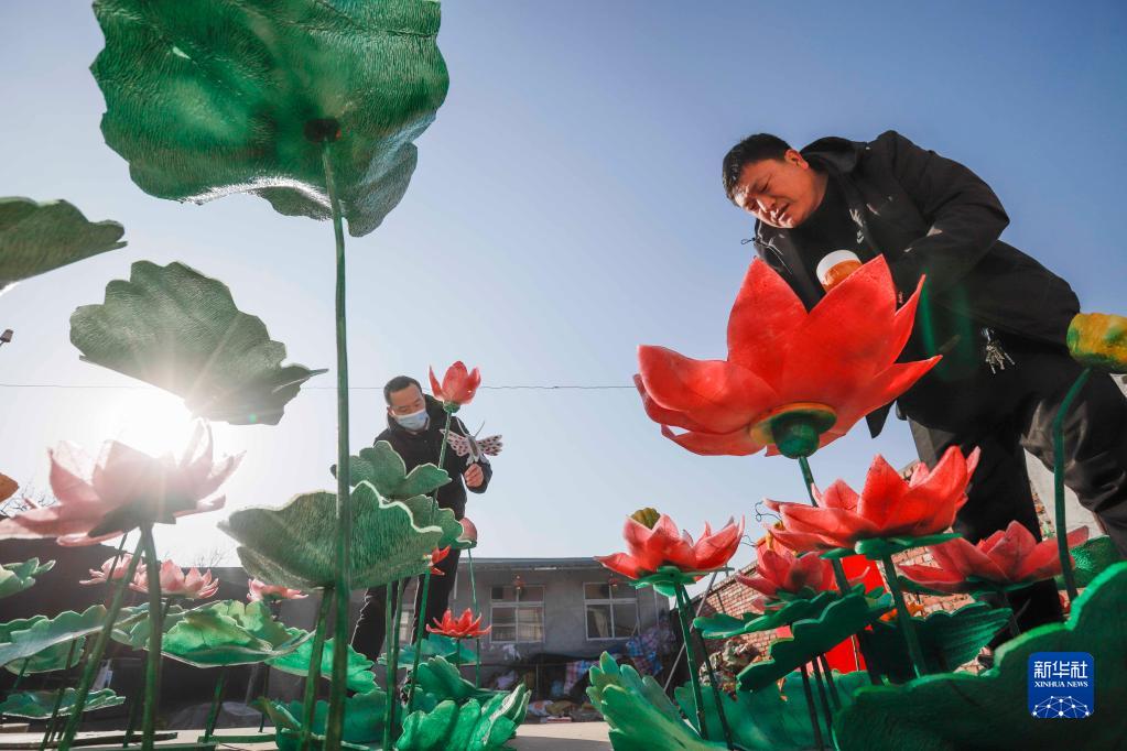 1月31日,河北省遵化市東舊寨鎮石橋頭村的民間藝人在組裝河燈,為元宵佳節增添喜慶氛圍。