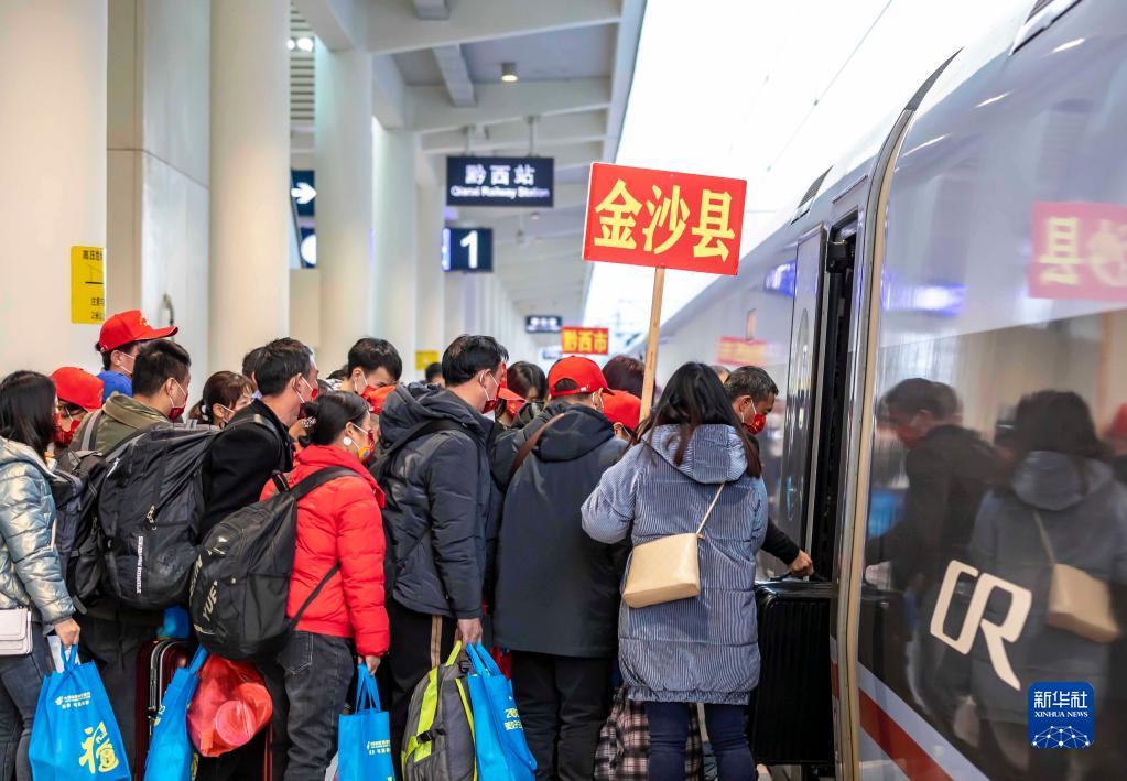 1月31日,務(wù)工人員在黔西高鐵站有序登車。