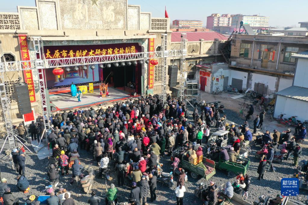 1月30日,太原市晉劇藝術研究院實驗二團演員在山西省太原市清徐縣孟封村演出(無人機照片)。