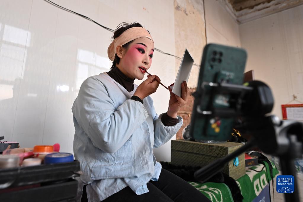 1月30日,在山西省太原市清徐縣孟封村,太原市晉劇藝術(shù)研究院實(shí)驗(yàn)二團(tuán)演員在后臺(tái)直播化裝。