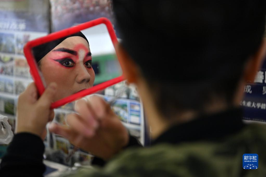 1月30日,在山西省太原市清徐縣孟封村,太原市晉劇藝術研究院實驗二團演員在后臺化裝。