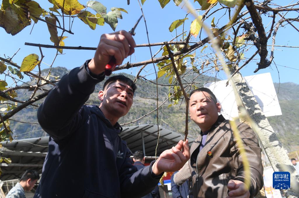 在菁盛鄉菁盛村,黃啟林(左)和在這里參加毛葡萄管護現場培訓的村民一起探討葡萄栽培技術(1月30日攝)。