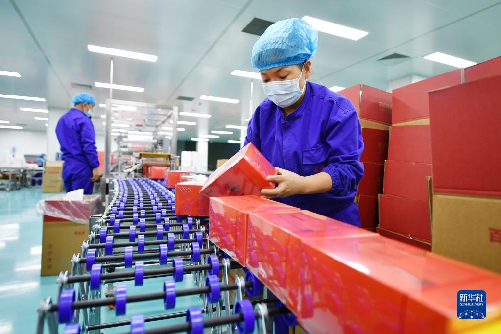 1月31日,在寧夏銀川市賀蘭縣一家枸杞深加工企業,工作人員在生產線上包裝枸杞深加工產品。