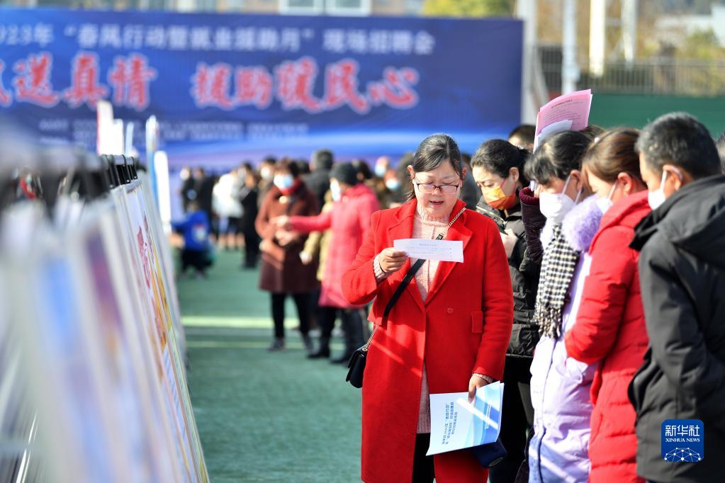 1月31日,求職者在湖北省襄陽市保康縣2023年春風行動暨就業援助月現場招聘會上了解崗位信息。