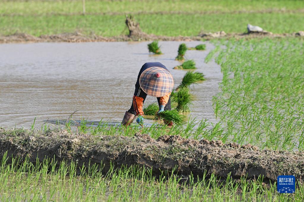 1月30日,農民在??谌〖墲竦毓珗@周邊的稻田里種植早稻。
